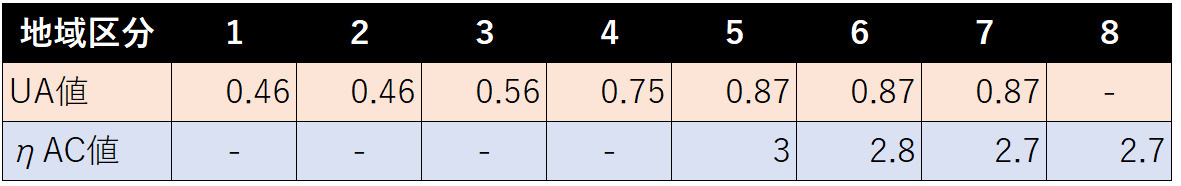 住宅の外皮性能は、UA値とηAC値により構成され、いずれも、地域区分別に規定されています。